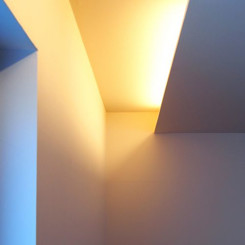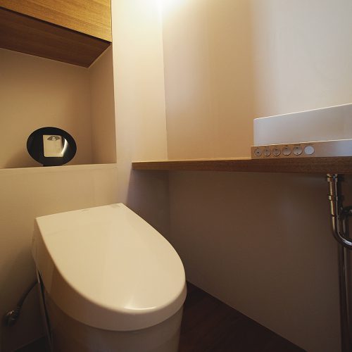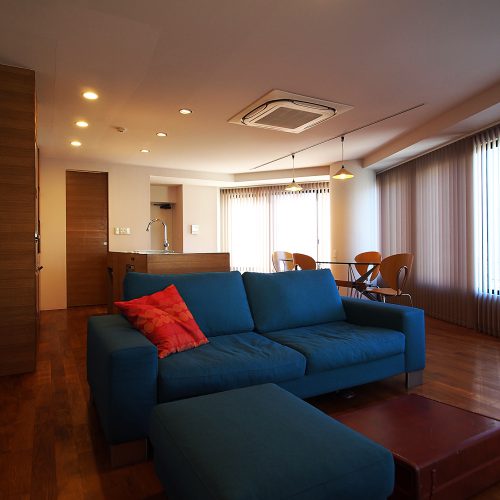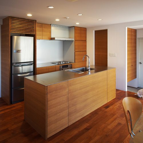 自邸リノベーションプロジェクト。平面形状、天井高さ、ともに大きくないスペースを、どのように広がり感を持たせ、心地の良い空間にするかを試みた。なるべく無駄な形状を排除し、空間として無機質なものとしながら、それぞれの部位やインテリアにおける素材を温かみのある物とし、心地の良い空間に造り上げた。