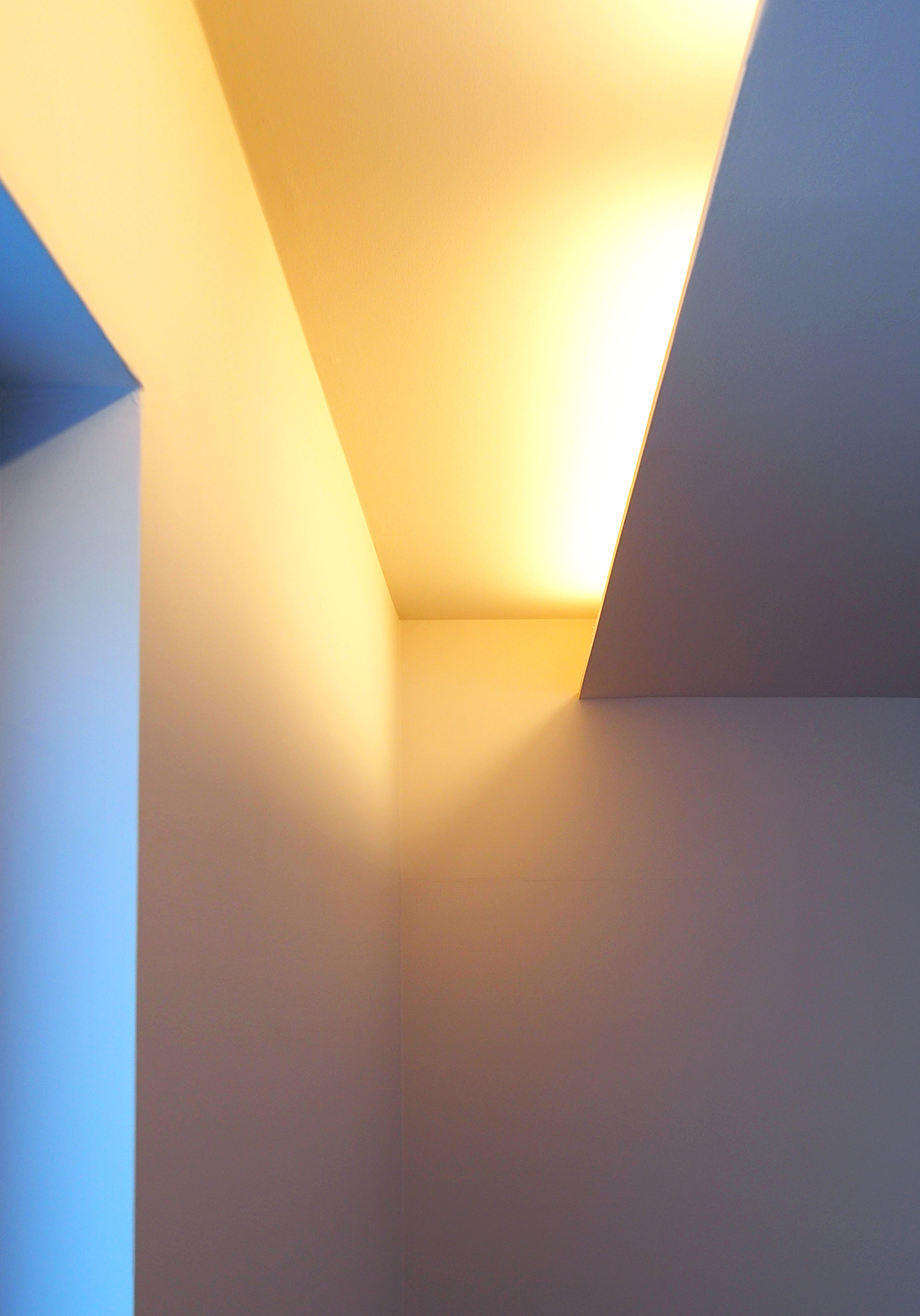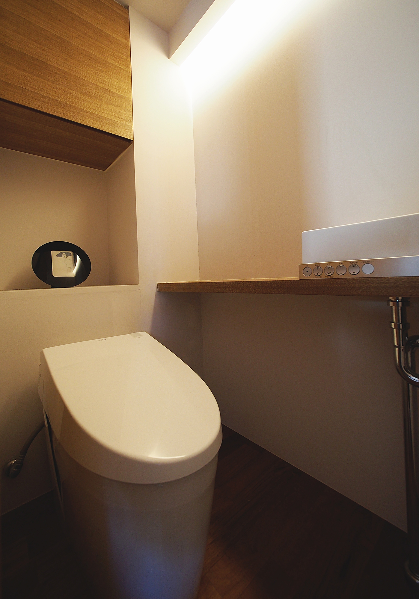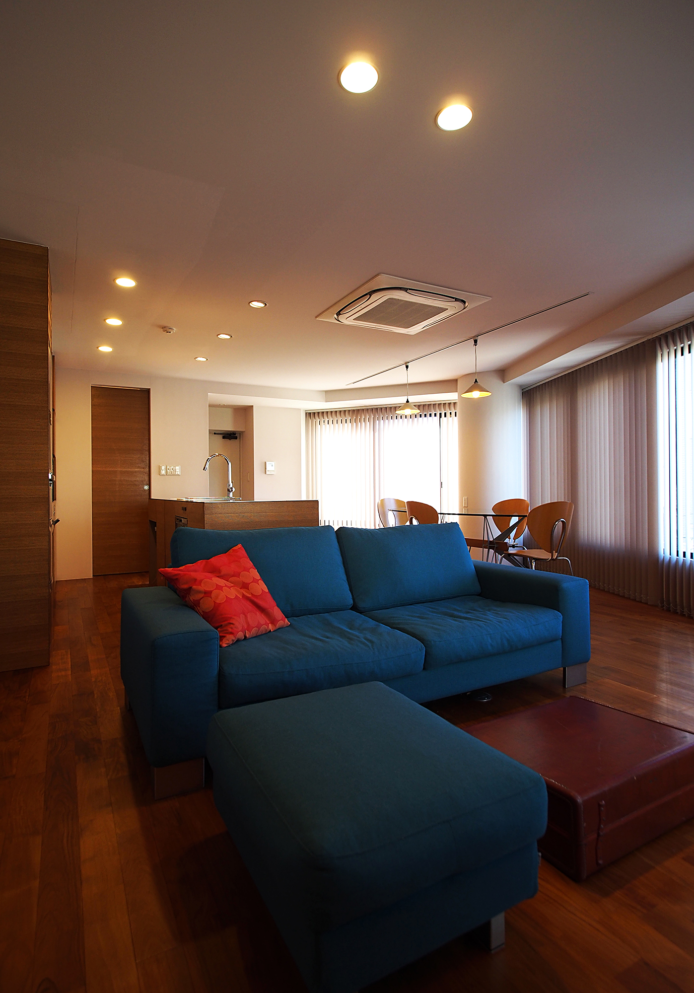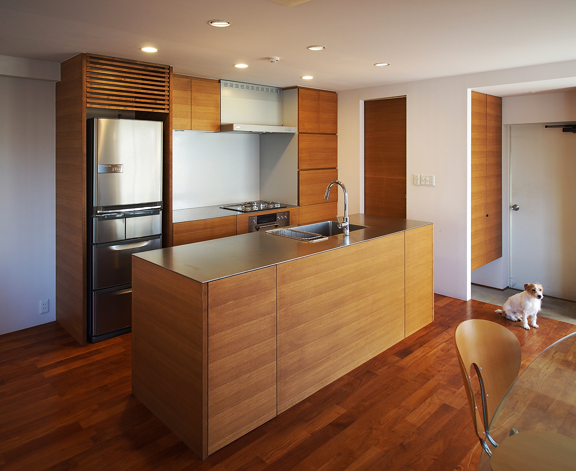 自邸リノベーションプロジェクト。平面形状、天井高さ、ともに大きくないスペースを、どのように広がり感を持たせ、心地の良い空間にするかを試みた。なるべく無駄な形状を排除し、空間として無機質なものとしながら、それぞれの部位やインテリアにおける素材を温かみのある物とし、心地の良い空間に造り上げた。